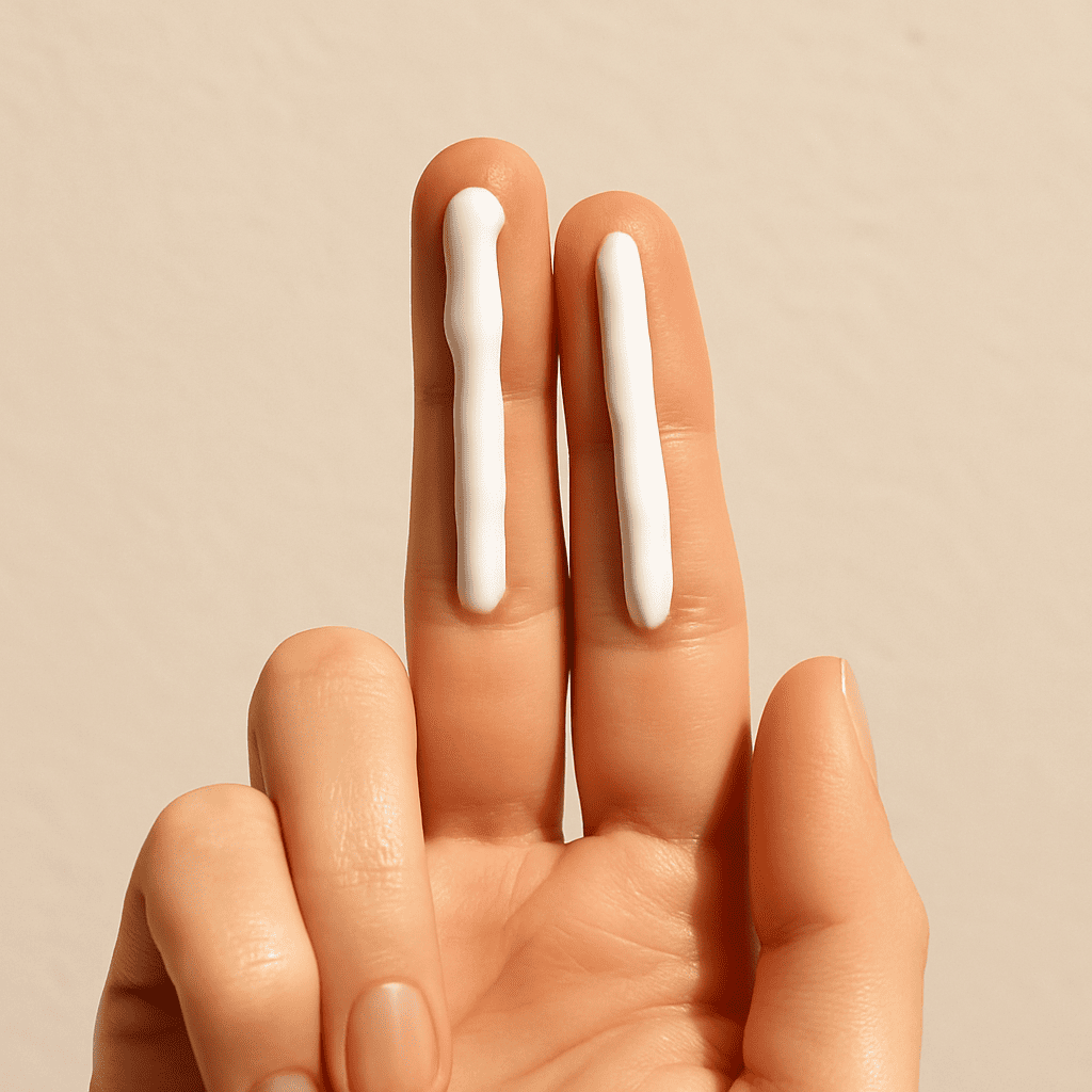 - Dica de Ouro: A quantidade faz toda a diferença. Para garantir a proteção indicada na embalagem, aplique uma quantidade generosa. A “regra dos dois dedos” é a medida mais fácil: aplique uma linha de protetor ao longo de todo o seu dedo indicador e do seu dedo médio. Essa é a quantidade para o rosto e pescoço.