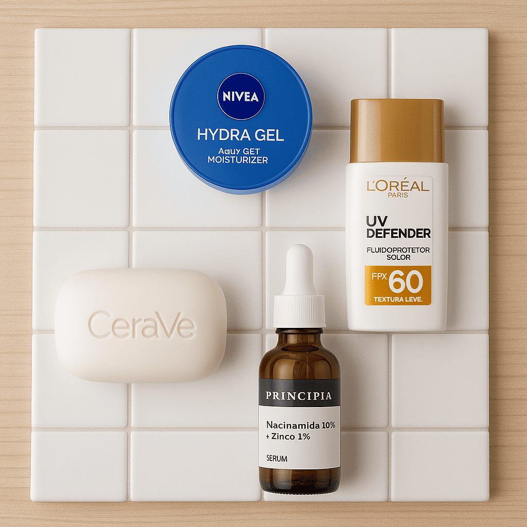 Prova de que cuidar da pele não precisa ser caro. Montamos um kit básico e eficaz com produtos que você encontra em qualquer farmácia.
